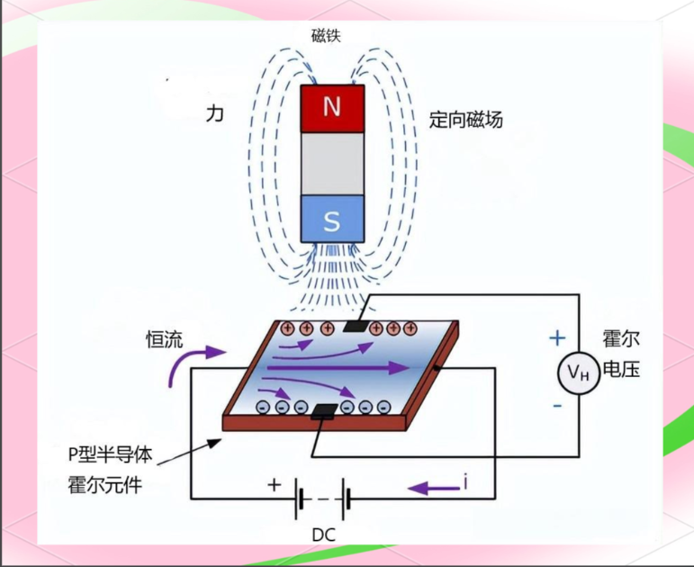 霍尔效应:把一块半导体基片(霍尔元件)放在磁场中。当在与磁场垂直的方向上通以电流时,则在与磁场和电流相垂直的另外横向侧面上产生电压。这一现象是1879年就读于美国霍普金斯大学的物理学家霍尔发现的,因此命名为霍尔效应。
