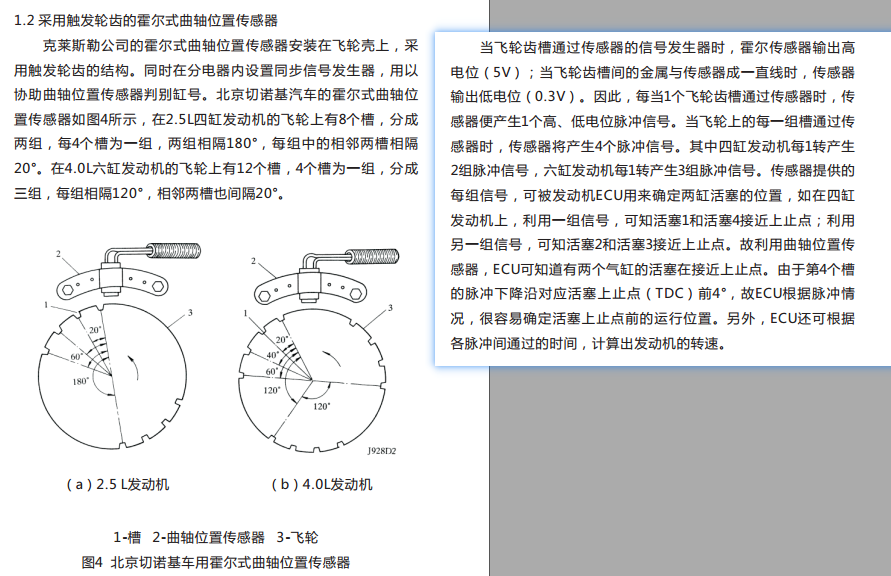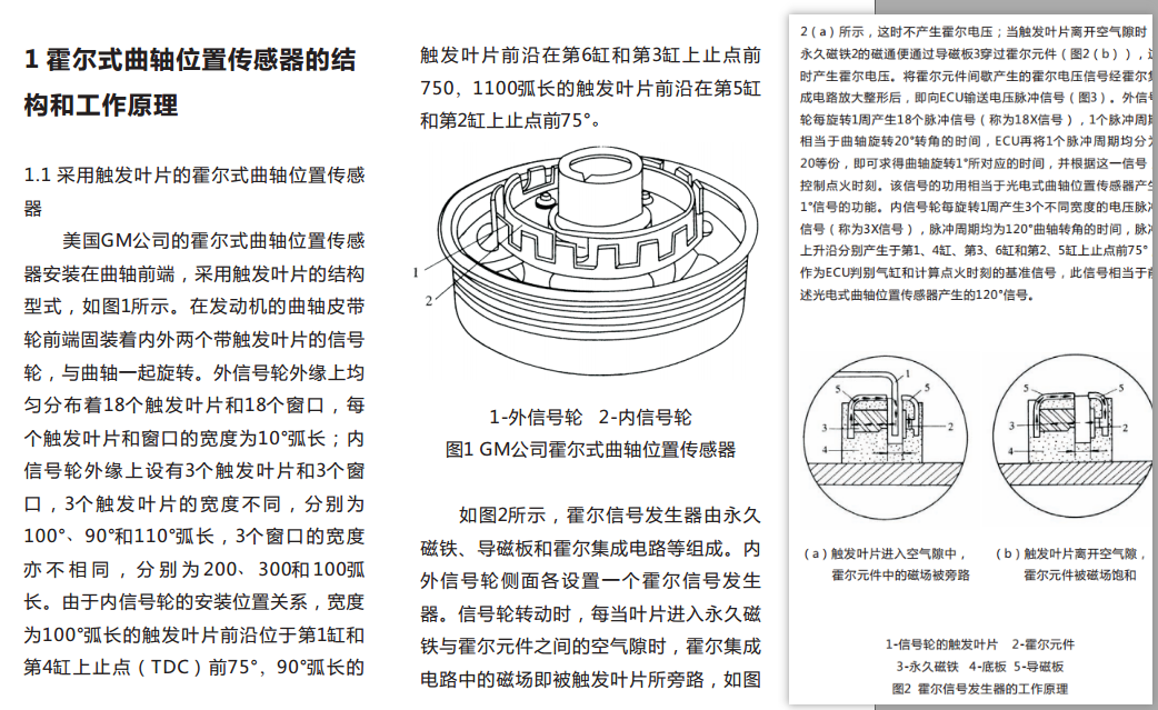 霍尔式曲轴位置传感器是利用霍尔效应的原理,产生与曲轴转角相对应的电压脉冲信号的。它是利用触发叶片或轮齿改变通过霍尔元件的磁场强度,从而使霍尔元件产生脉冲的霍尔电压信号,经放大整形后即为曲轴位置传感器的输出信。